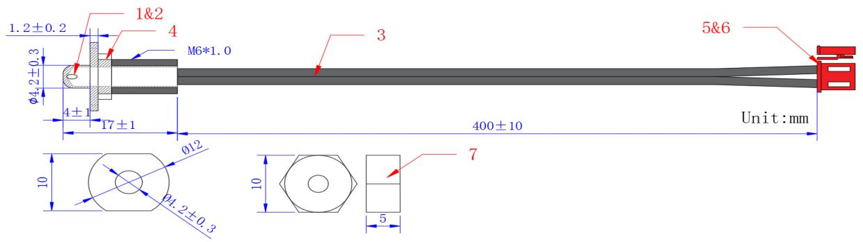 采用M6不銹鋼外殼封裝ntc熱敏電阻,與耐溫105度導線連接,使用螺絲安裝固定測溫,可用于測量如咖啡機,豆?jié){機,熱水壺等產(chǎn)品的溫度